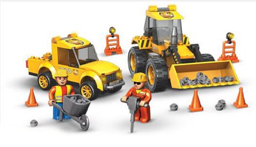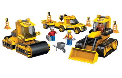 The Mega Bloks Blok Squad Construction Site Set was released in 2010 and features three Construction vehicles, a Construction Vehicle 4x4, a Track Loader and a Road Roller, along with three Construction Workers minifigures. This set contains a satissfying 395 pieces.