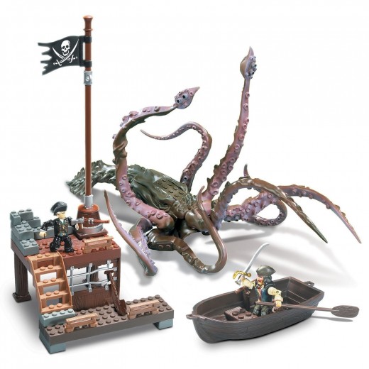 The Kraken is a titanic, tentacled scourge of the seas, this legendary leviathan does the destructive bidding of the Flying Dutchman, hunting down and playfully devouring its overwhelmed prey. The Kraken in this set has fully poseable tentacles with which to capture prey and you can even attach Bloks and figures onto its surfaces. You can build the dock station and man the rowboat to defend against (or escape from) the monstrous ruler of the ocean. Also included is a hidden webcode inside the toy to unlock information online.