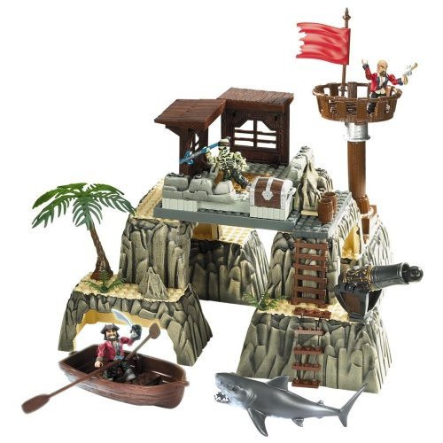 The Smuggler's Fort set was released in 2005 and features an interactive fort and harbour for the pyrates and their vessels. Also included are 3 Mega Blok men, a Privateer (Blackteeth McBaine), a Skeleton Crew member (Maritrocious) and a Sea Marauder (Lockpick Cabot). This set contains 60 pieces.