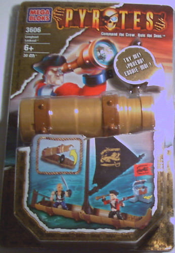 The Longboat Lookout set was released in 2005 and features a spyglass that opens up into a canoe as well as weapons, flags, sails and treasure chests. Also included are 2 Mega Blok men, a Privateer and a member of The Sea Marauders. This set contains 30 pieces.