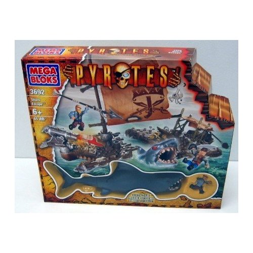 The Shark Escape set was released in 2005 and features an attacking Shark and a Pyrate raft. Also included are 2 Mega Blok men, both Sea Marauder crew members (Oliver Lugsail and Jonathan Juryrig). This set contains 95 pieces.