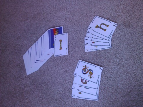 Quiddler involves cards with a letter and points on each card. You start with three dealt cards and one open card besides the stockpile. The youngest player starts by building a three letter word and can make a word with his existing cards or the open card or pick one from the stock pile. The moment you complete your word and lay down your cards, the next player(s) have to do the same with the opportunity to do so either with the open card laid down by the winner or pick one from the stock pile. If you cannot make a word you score zero, or if you make a word and discard more than one card which is then deducted from your total score, you make a zero if the total runs into a negative. Else your score would be the word total less the discard card score. This is continued for eight rounds with an extra card dealt in each successive round. Hence the sixth round has eight cards dealt and the last has ten cards dealt. Words less than three letters are not permitted. The person who has the highest score at the end wins. A good game for letter / word lovers and great for children to build their vocabulary.