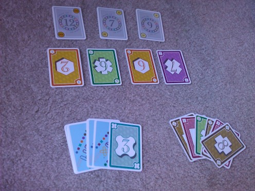 Linx is another card game which has numbers and symbols on the cards. There are two sets of cards- scoring cards and playing cards. The purpose of the game is to make links with the anchor cards on the board and score accordingly. Each player is dealt ten cards to begin with; there will be three scoring cards displayed which tell us the minimum number of cards required to make a chain or link. So there can be scoring cards of five or eight or twelve (being the highest chain) chains and one gets higher points for the longer chain. A chain is started with either of the four anchor cards displayed, so your next card can be a matching number or a matching symbol and so on and your last card has to match with another anchor card on the board. Once you lay down your chain, you clear the two anchor cards and your chain and pick the corresponding scoring card to add to your score. Two new anchor cards are placed and a new score card is replaced as well. There is an open card and a stock pile to choose from and each player can pick two cards once he has less than ten cards in hand. If you cannot make a chain in your turn, you need to discard one card. If you do make a chain, you do not need to discard any card. The highest scorer wins and the fun or frustration arises when you are working on building one chain and your opposition ends up making a chain with your anchor cards and you got to start all over again! This game tends to stretch for as long as two to three hours when playing with two players!