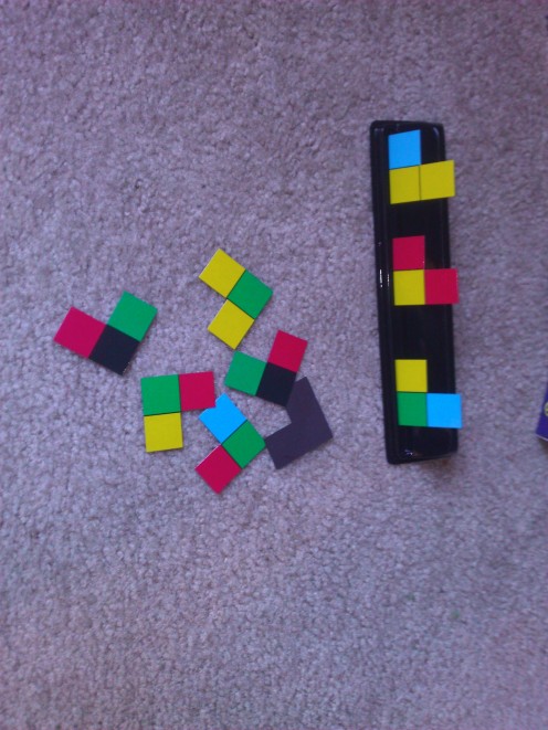 Tilz is another fun board game where you need to analyze and play smart with your tiles on hand. The board is a magnetic one and there are a bunch of L shaped tiles with 3 coloured boxes on each. The idea is to place a tile on the board that matches on at least one side with another colour on the board. The more sides with the matching colour, the more you score. There are stars on the board at various places which gives you double the points. One can plan and save a tile for the most opportune turn or place for the tile and score high. You start with three tiles and keep replenishing them as you place one tile in each turn. Again the highest scorer wins and this gets tricky as the board starts to fill up!