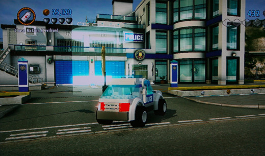 Your first mission is to make your way to the police station, which is easy enough once you hop in your car at the end of the pier. Follow the trail of green studs and you'll find the way to the police station easily enough. Note that you can 'confiscate' cars from other people by hitting X, both inside and out of your car, and that unlike other open world games there is no penalty for doing this. Indeed, there are benefits to causing mayhem in LEGO City. Careful driving is important eventually, but not at this point.