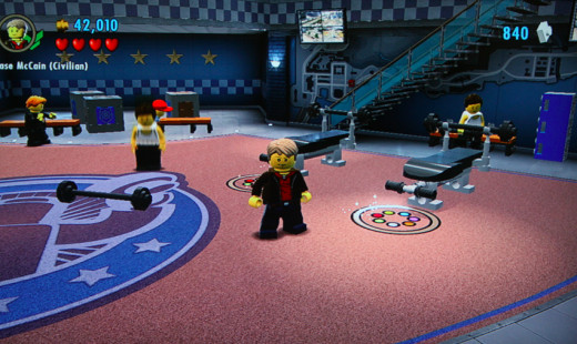 Follow Frank around the top floor and to the left. He'll knock a bunch of boxes down into the gym area. Check out the machines down here - they all have simple button-tapping games that will earn you studs - and check out the boxes as Frank suggested. Bust through them and assemble what you find to get the Chase McCain (Police) outfit, which you can change into by holding X. That done, follow Frank upstairs to meet another member of the team, Ellie. She'll give you a police communicator that you'll use for a great deal of navigational work.