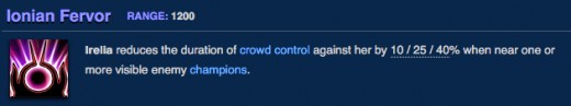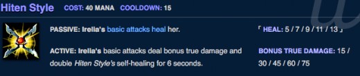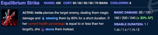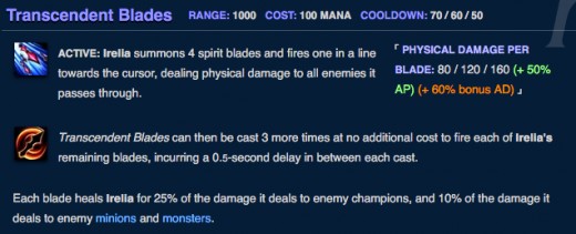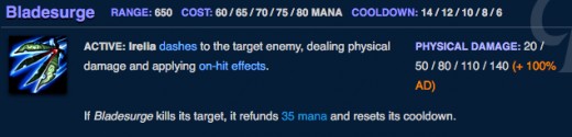 Irelia’s main skill. “If Bladesurge kills its target, it refunds 35 mana and resets its cooldown”. Very important thing to remember, especially initiating and retreating. Also, use this skill to last hit minions. Often times one auto attack wont do the trick when last hitting.