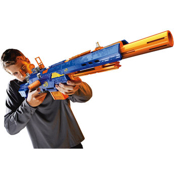 If the idea of firing long-range shots at unsuspecting ‘enemies’ is appealing, the Longstrike is the gun to consider grabbing. It is modeled after a sniper rifle, making it the longest gun in the Nerf line-up (by a nose). The overall design along with the added accuracy due to the flip-up sight makes it perfect for pint-sized snipers (or comically malicious adults). Just be sure to find a good hiding place.