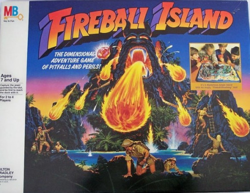 Fireball Island came out in 1986, and was a plastic moulded 3D game. A rotating idol is placed in the middle of the mould and the idea of the game is to move your explorer men counters up the paths, and through caves, in order to steal the idols ruby and get it back to the waiting boat. Throughout the game the Idol spits out marbles that roll down the paths and will knock over any explorer men that happen to be in its path. Can you get the ruby back to the boat in time?