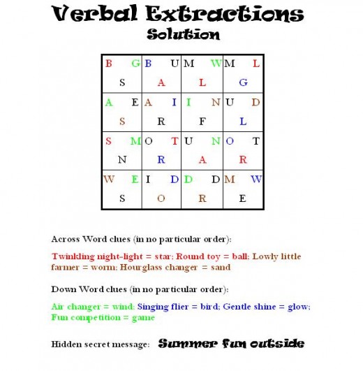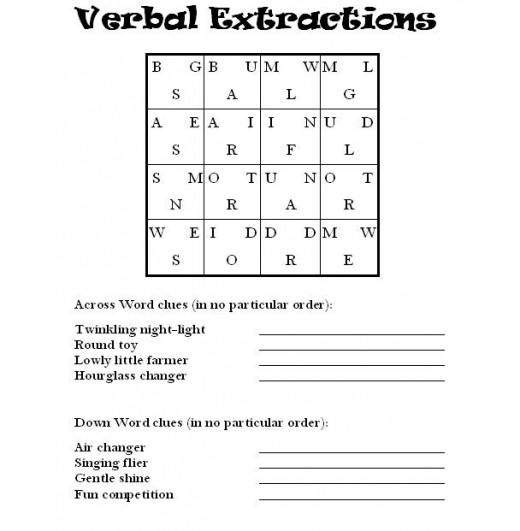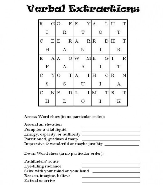 Verbal Extractions word puzzles are scrambled-letter word grids. Many times, they are made up of 6x6 grids, but the example for kids given here is made up of a 5x5 grid. Each square in the grid contains three letters, one belonging to a five-letter word that reads across the row; one belonging to a five-letter word that reads down the vertical column; and one letter left over in each space.