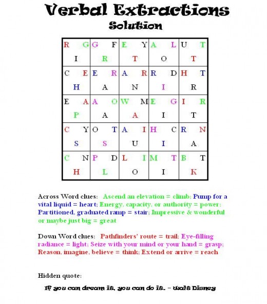 Sometimes in solving a Verbal Extraction puzzle, it is just as easy to first locate the word in the grid and then associate it with the correct clue as it is to solve the clue first and then to locate the word. But be careful! There may be some hidden words that do not answer any clues. Don't let those words throw you off-track!