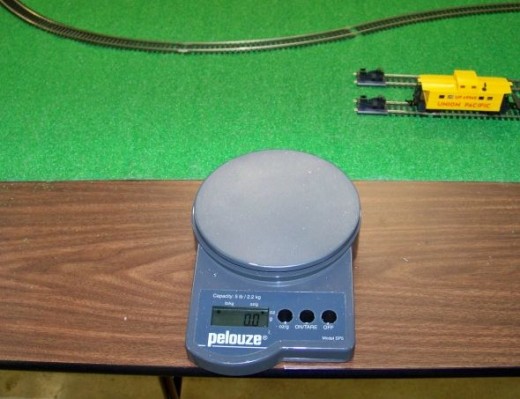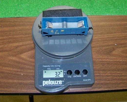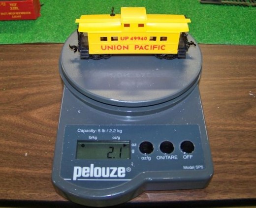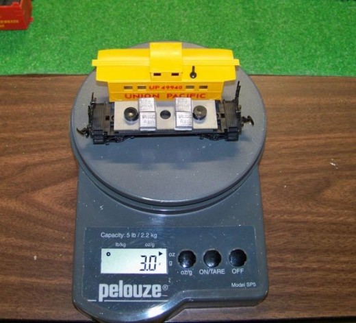 Caution: Self-adhesive wheel weights used to balance wheels are made of lead, you should wash your hands after handling them and do not allow children to handle these weights. If children are going to play with the rolling stock cars then I recommend using some other means of adding weight to the rolling stock cars.The first thing you do is determine the initial weight of the rolling stock car. For example my caboose was 2.1 ounces. See picture above.