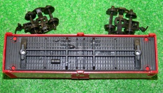 Some brands of rolling stock cars are glued together, you will need to drill out where the top and bottom of car attaches so that you can add the proper weight. See the four circled areas in the picture above.
