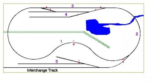 I temporarily set up track using the Power-Loc track system included in the train set. The setup was a double oval layout and used manual turnouts to switch the train from the outer loop to the inner loop. This was all fine and good but the track layout was boring and the Power-Loc track did not look authentic enough for me. I then went to a local hobby shop and purchased Atlas Code 100 track and set it up in the following layout.This layout is offered under the beginners section on the National Model Railroad Association (NMRA) site.