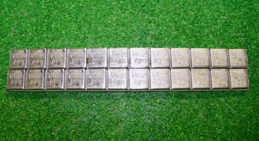 According to the Weighting Rolling Stock page on the NMRA site, the formula for HO scale is an initial weight of one ounce plus an additional half ounce for each inch of car length. For example, the appropriate weight of a 7 inch HO boxcar should be 4.5 ounces 1 + (7 x 0.5) = 4.5 ouncesIn order to add weight to the rolling stock, I decided to use self-adhesive ounce wheel weights used in the auto industry. These weights can be obtained at places like the Amazon web site. Above is a picture of the wheel weights.