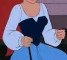 Version 2: The first version we see Ariel wearing, but only very briefly (thank goodness). This again is a long tube, but the hemline is cut very jaggedly. The gap is on the left rather than the right, but appears to be much lower-set than the hip-high split in the first version. The fabric extends unevenly the topmost piece of rope, and the rope is wrapped twice around the waist. A large piece of the cloth is pulled up through the gap created by these two waist-ropes and hangs out on the right side. Picture 6, below, illustrates this version.