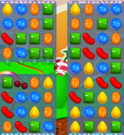 - The first thing you have to understand is how the 3 sections of the board work. The bottom left is actually where the candies start. If you make matches in this section, the candies fall to the right section. From the bottom of the right section, the candies fall into the top left. See those little arrows at the bottom of the top left? That means that’s the only place where your ingredients will fall. The real “bottom” in this level is the top left section.