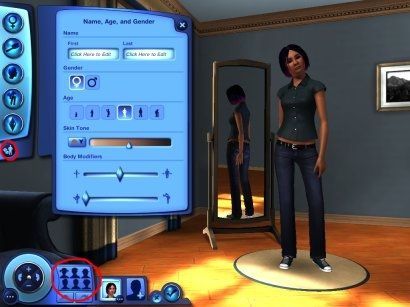 When you first load Create-A-Sim, you will notice that there is a pre-created sim standing in front of a mirror. This sim is, essentially, your canvas -- the blank slate with which you may begin. If you prefer, you can choose a different sim by either clicking on the "randomize button" (the upper circled button) or on the "select sim" button (the lower circled button).