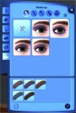The eyeshadow options are shown in the image to the right. You can choose from one of the five colors that are provided for you, or, using the paintbrush button, you can choose a color of your own. You will have an entirely new palette to work with (shown below) so that you can adjust the color of your sim's makeup as you please. You also still have the color wheel available to you.