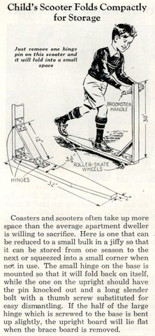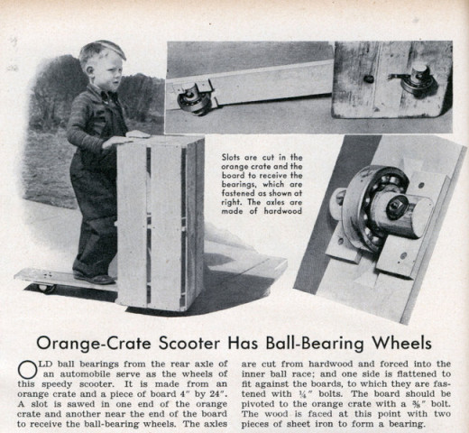 On this page you will find an article about the history of the kick scooter. While doing research I found two articles from vintage magazines you might also find interesting. One is an illustration for a kick scooter from 1938; the other article is about an orange crate scooter. These articles are even older than me!