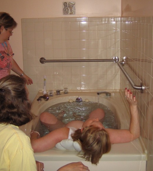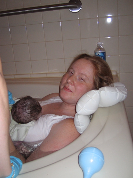 As soon as I could, I got in the tub and while my contractions were still painful, I felt that they were infinately more manageable than when I labored in bed during my daughter's labor and that I was also in more control of the birth of my son. As I entered the warm tub, I instantly felt relief from the contractions. I could still feel the tightening, but it wasn't nearly as painful. My muscles were allowed to relax and soak in the warmth of the water, and I was able to work through the labor naturally, listening to the coaching of the midwife and my doula the whole time