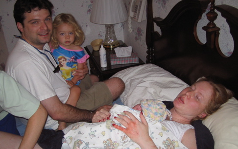 My labor started at 5am on Saturday, July 10th, 2004 when my water broke. I called the midwives immediately and told them, and they told me to get to the Birthing Center now! (My birth with my daughter was only 4.5 hours long once my water broke, so we knew we didn't have much time!) We arrived at the birthing center at 5:20am, and I labored on the bed until the tub was ready for me.