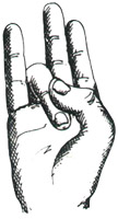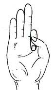 The tips of ring and middle finger touch the tip of thumb and the index finger touches the base of thumb with the little finger stretched out. It will work for our heart like an injection and reduces the chances of getting heart attack. It helps to strengthen our heart and regulate palpitation. It also help regulating exretory system and reducing gastric problem. Any one can practice as many times as he or she can. Practice for 15 minutes will be enough to get rid of hypertension.
