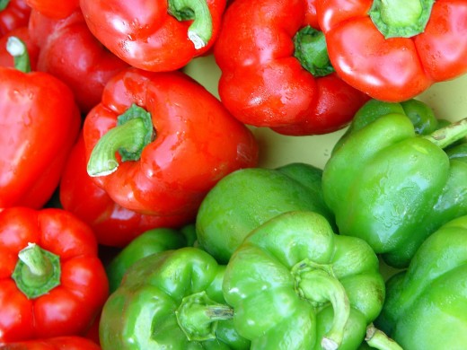 Both green and red peppers contain a large amount of vitamin C per serving. However, red peppers contain slightly more. Peppers are delicious on pizza, and go together great with steak and cheese subs. Red peppers in general contain a lot of vitamin A and vitamin C. In one 100 gram serving size, there are 31 calories, 4 milligrams of sodium, 6 grams of total carbohydrates, 2 grams of dietary fiber, 4 grams of sugar and 1 gram of protein.