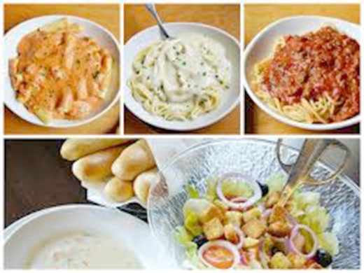 Like oatmeal, spaghetti is also loaded with carbohydrates. Spaghetti is great to have with chicken parmesan, seafood, meatballs, salads and other foods. Although the dinner entrées at Olive Garden are high in sodium and sometimes fat, they make excellent meals before or after exercising. In one 2 oz. (56 grams) of spaghetti, there is about 200 calories, 1 gram of fat, 44 grams of total carbohydrates, 2 grams of dietary fiber, 0 grams of sugar and 4 grams of protein. In gluten free spaghetti, there is rice flour, corn flour and mono and diglycerides.