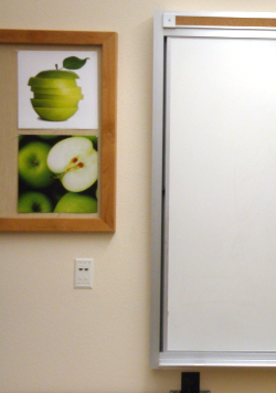 These green apple posters (seen in the photo) are right next to the main whiteboard at the front of the classroom, so are seen by the students as the look to the front of the classroom.