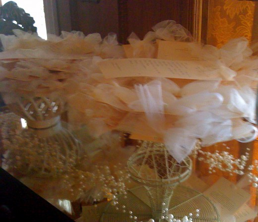 The day of the wedding, the programs were arranged on silver trays and placed by the door for the guests. They made an elegant display with scattered pearls placed underneath.