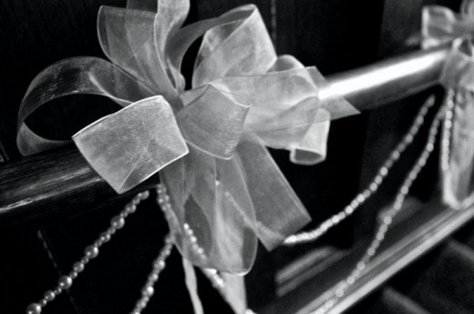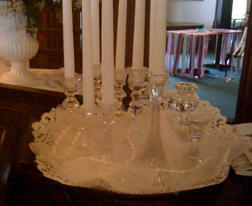 A baby grand piano can provide a focal point of decoration, lending to the general atmosphere of the event. Candles are always welcome touches to a wedding and/or reception. A special tray or mirror can be used for the base of a candle display. A collection of inexpensive glass candle holders can be randomly placed on your chosen surface. Use eight to ten holders, depending on the size of your display. If you have rolls of tulle, wind it loosely around the candles to soften your display. Sprinkle some pearls amidst the candle holders and add candles for a warm candle arrangement. When the pianist is tickling the ivory keys with a wedding march, they will have a romantic backdrop of light.
