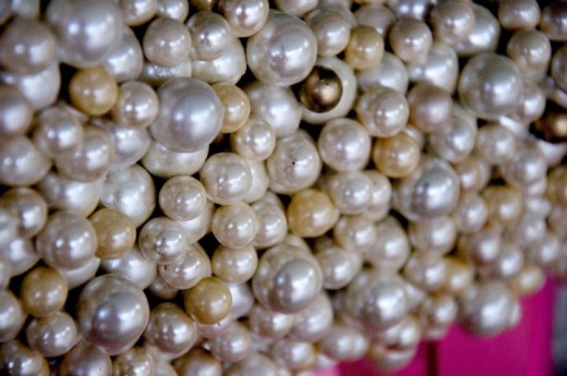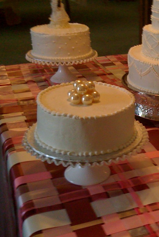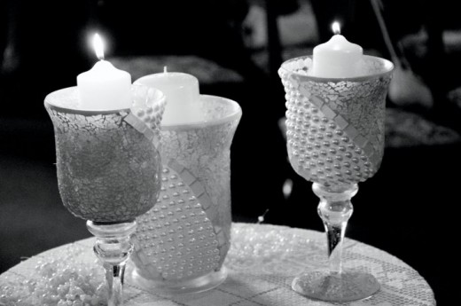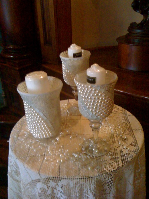 I like these candle holders for several reasons. They accent the pearl theme in the wedding. The outside of each container is covered with pearls. As the candles are lighted, they are protected from falling off of the table and the dripping candle wax falls safely inside the vase. The table cloth is protected from wax mishaps!