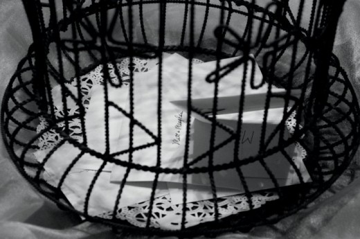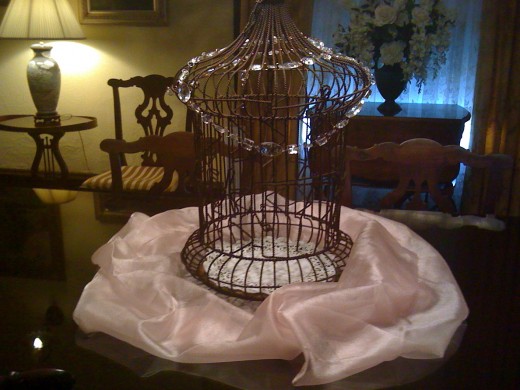 At our son's wedding, a bird cage was placed on the table for the cards. I thought it was a clever idea! It looked elegant with the tulle and pearls wrapped around it.