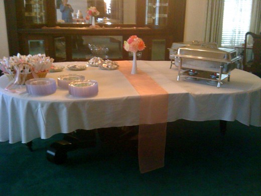Various widths of ribbon were used to cover the table. If you look closely, you will see the ribbon variations. It was a special touch on that special table! The groom's table had a few strands of ribbon across it to carry out the theme!
