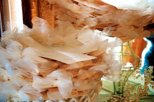 Our son was married just a few weeks ago. Two days before the wedding, some family and friends gathered for dinner. We used this time to prepare the wedding programs. The bride chose to tie tulle bows at the top of the page. Some of the men cut the material and the ladies tied the bows. It took just a few minutes to assemble the programs while we chatted.