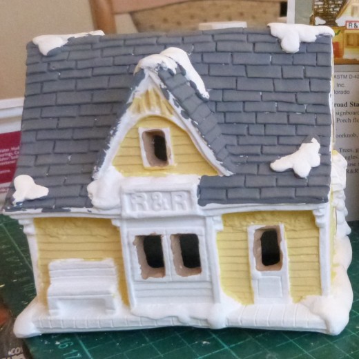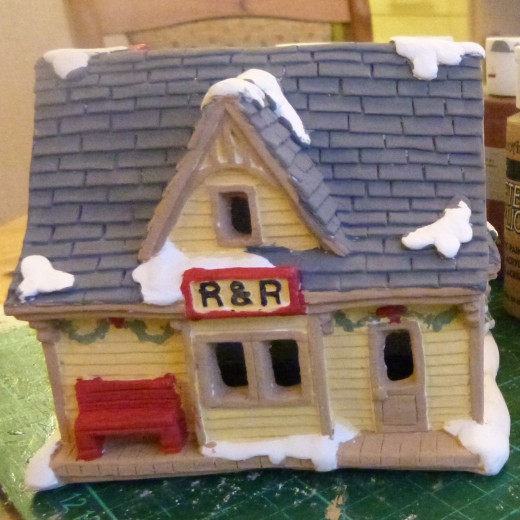 Dept 56, Thomas Kincaide and Lemax produce some of the most beautiful Christmas ornaments available. They are also ideal for anyone who wants a ready made village. But if you are on a budget or if you fancy trying your hand at a bit of painting, a very effective village can be made from readily available white plaster houses. We have a collection of buildings including churches, banks and post offices and..... I have have an unfinished one at this time which I will include in this article and show you how it transforms from white plaster into a lovely decoration. All you need is a clean surface, acrylic paints and paint brushes. Make sure you have the Christmas colours of red and green. White snow can be created by leaving parts of the model plaster unpainted.