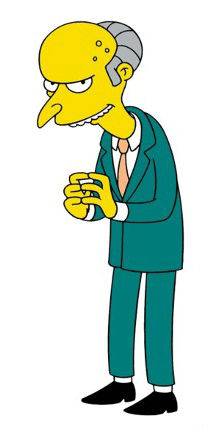 Mr. Burns is usually dressed in a suit. His back hunched, his head is balding, and usually he steeples his fingers together while repeating his favorite phrase "Excellent." Almost always seen in the company of his employee Waylon Smithers.