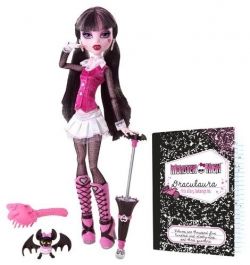 Draculaura or Lala, as her friends call her doesn't look a day over 16 ... but her age is really 1600. She is the daughter of Count Dracula and you know how vampires stay young forever. Draculaura's dad might be a famous blood drinker, but she can't even stand to hear the word blood. She is a bit of a ditz but that's part of her girlish charm and she is happy just about all the time. Her hair is black with red streaks in the front and she has a set of very cute fangs in her mouth. Her outfit is darling, it's a batty kind of costume for Halloween. It has beautiful black and pink bat wings, a jagged edge purplish skirt worn with a white corset top and is surrounded by a sparkling purple and black long accent skirt. Her shoes are webbed heels and she carries a little pink skeleton doll. It's such a festive Halloween look. Sometimes you might see Draculaura with an umbrella and that means she wants to take a sunlight stroll!