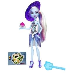 Abbey Abominable is the daughter of the Yeti, you may be more familiar with the term "The Abominable Snowman" or "Big Foot". Abbey is a foreign exchange student at Monster High, she hales from up north somewhere. I'm not sure if it's her dad or her mom who is the Yeti, it could even be both of them. Abbey seems kind of tough, but it's probably because she doesn't really understand the language and something gets lost in the translation. She is a very warm person when you get to know her but can seem a bit icy if you don't know her well. Abbey is dressed in an icy costume and her skin is blue. Her shoes like are clear as ice and they have a cute blue sock top, her outfit is . Her boots are big and furry and fluffy, she has furry wristlets on and her dress looks like it's made out of glittery snowflakes. Abbey's hair is platinum blonde and has some punky streaks in red, purple and blue.