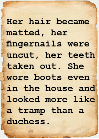 She was widely regarded as being completely mad. As she grew older her eccentricities increased. She turned her country home into a small farm and kept chickens and other assorted livestock. The woman who had been applauded as the most beautiful and intelligent socialite of her day was transformed into an eccentric and deformed old woman. Local children believed she was a witch.