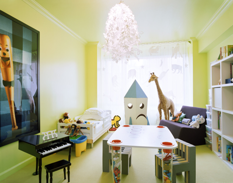 Colorful lighting fixtures add fun and interesting focal points to kids’ playrooms. Children’s lighting comes in a large assortment of cool designs to complement any playroom theme. Ikea sells kid-friendly hanging light fixtures for under $30, and LED stick-on lights only cost about $20 (pack of three) at Amazon.com. Peel-and-stick lights can be placed at the level a child can reach, and they don’t require cords and electrical outlets.