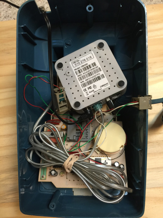 Once all the connections are correctly installed place the OBi200 and all other parts inside the telephone casing and screw the telephone bottom plate back on.