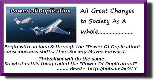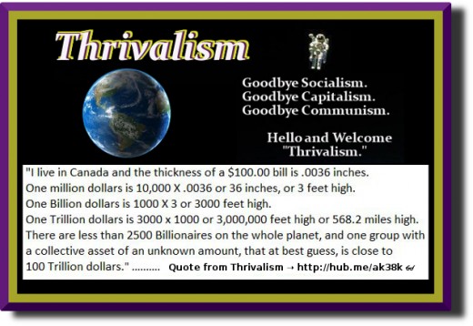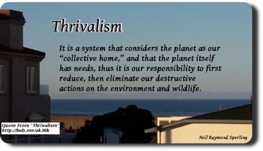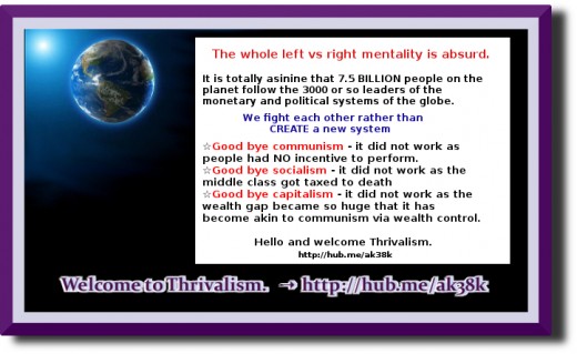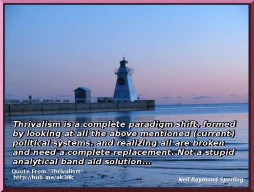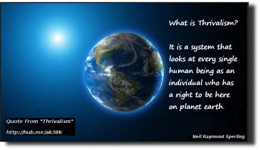I believe in humanity. We are powerful creators with the capacity to create beautiful things. I believe we all want the same things. To be healthy, happy and enjoy this journey called life. I believe the world is a beautiful place and humanity can create an even more beautiful place by changing the way we look at Economics and Government. Thrivalism explores possibilities of change in those areas. Today is old news, manifested realities of past thinking and actions. What tomorrow brings is today's ideologies.
