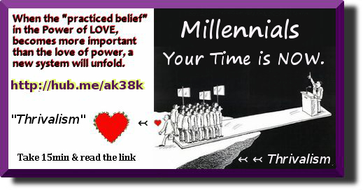 As Millennials embrace their own power, they will realize the world can be, even more beautiful than it has ever been imagined. I encourage all Millennials who read this, take the time to study the links..... the future is yours to create. Go forward with knowledge of the changes possible.
