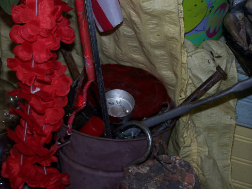 Lastly, either a picture of a saint attached to him, or a warrior figure or picture. You could use a Celtic god of war if you like, a GI Joe figure, or a picture. Remember at least 80% of Haiti lives below poverty level, so anything they can find that suits him is used there. Ogu is not shy about letting you know if he likes things or not. And for the basic bare bones altar, that is it. You can add as you go along. One altar has a metal bucket filled with railroad ties, broken glass, volcanic rocks and coal. All things Ogu likes.