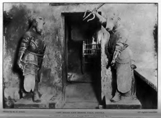 At the end of the right hall is a small archway through very massive walls, guarded on both sides within by the Wu Dzang Moh-Phil, who are the spirits of the lower world, ready at any unexpected time to seize their victims and escort them below. Their very appearance is enough to inspire terror and some Chinese children suffer severely from the effects of their first experiences with such goblins. Every delineation is calculated to inspire terror and the aspect is sinister in the extreme. Back of these devils in the gloom, and not shown clearly in the photograph, is His Satanic Majesty.
