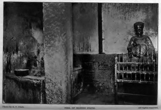 Behind guardians who are especially sinister in aspect is the chamber of the Pool of Bloody Filth. Into this pool, all women who die in childbirth are plunged. In the photograph the Queen of the Pool is at the right, and to the left is the stone pool, with a couple of devils waiting in glee to get their next victims.