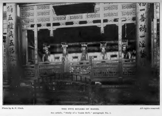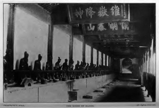 Back of this hall where hang the bell and the shoes of two women is a room lit from above, gloomy below, retired and awe-inspiring, where sit in solemn majesty five rulers of the Hades, whose original seats are on five peaks in China.