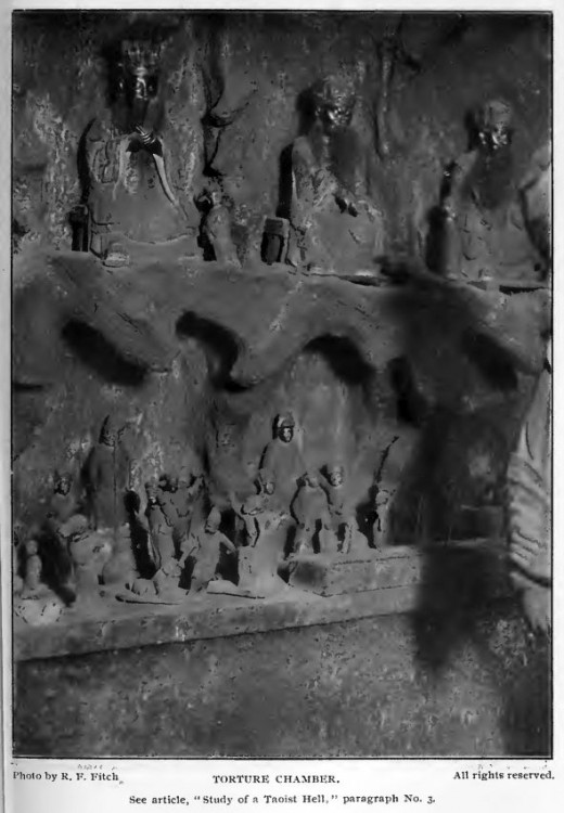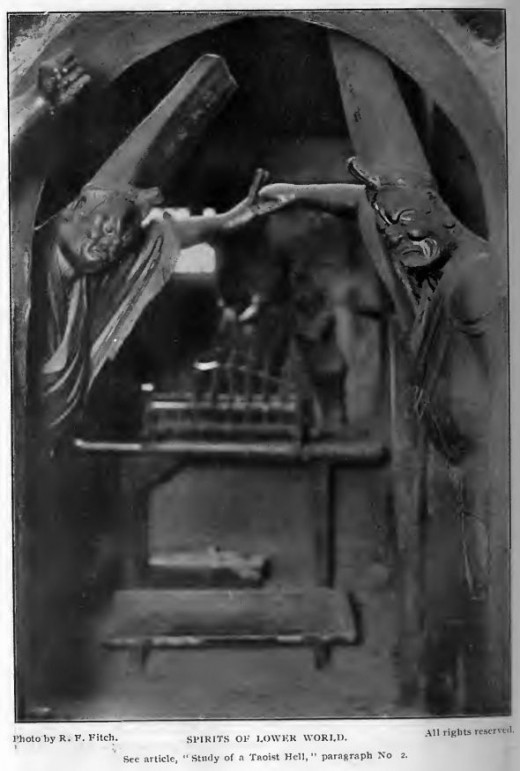 The Taoist hell herewith described is financed by a family at Dzkyi, a city within the Province of Chehkiang. A rich man by the name of Dzen raised a large subscription within his clan for the erection of the hell, and the members of his clan who are Taoist priests take their turn in coming to Hangchow, to the Taoist hell, to live on the profits for a year and then return for another priest to take his place. The institution brings large profits to the clan. It is an elaborate scheme for making money out of the credulity of pilgrims (especially women), who congregate at special seasons in large numbers, burn their incense, their paper money, and recite their prayers, with the hope of saving themselves or their relatives from the tortures of hell, and also with the hope of accumulating both money and merit in the future world. From the first to the middle of the seventh month of each year, the ashes from the paper money bring several thousands of dollars, the residue of tin being taken out and remade into paper money.
